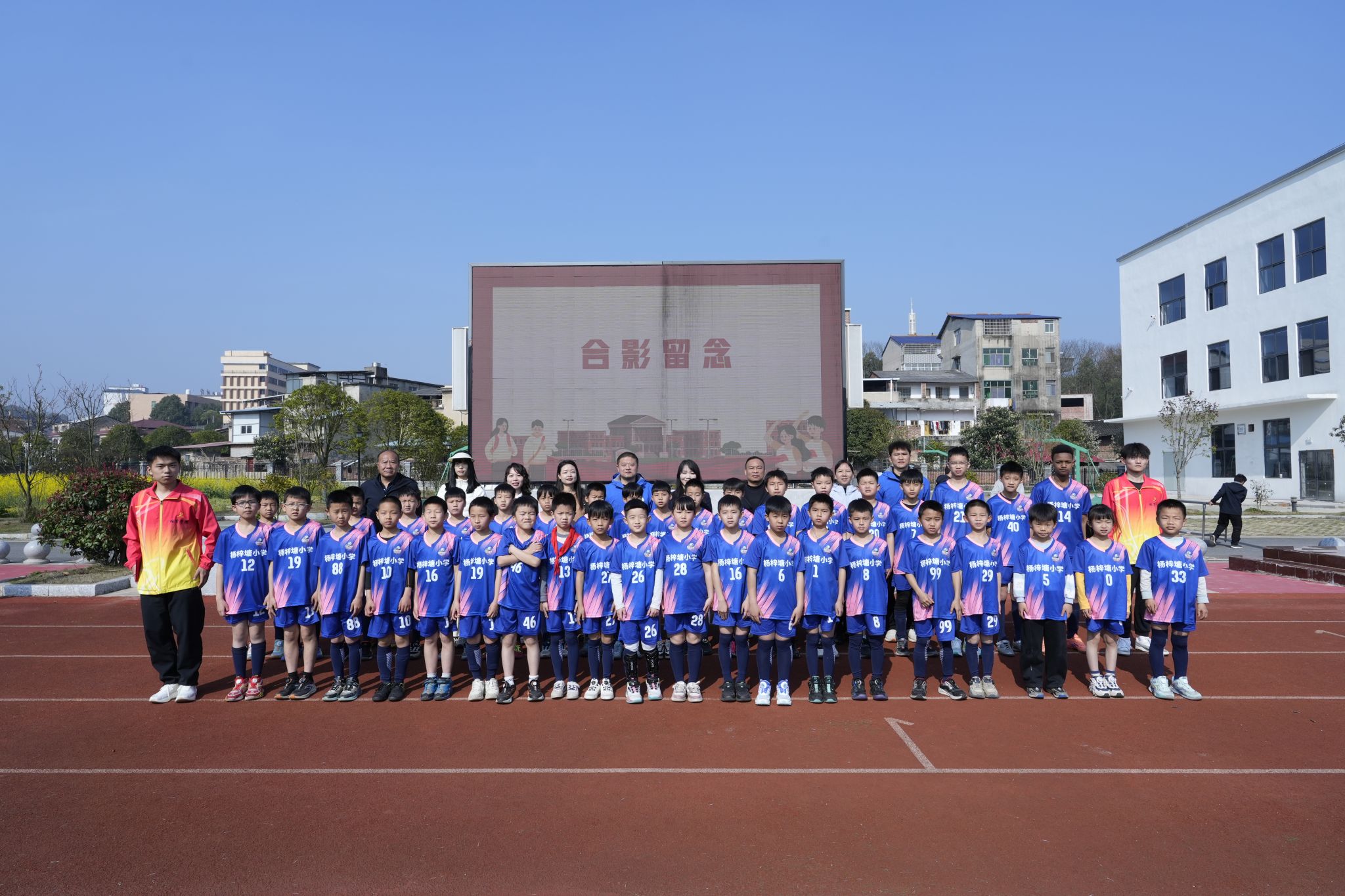 仪式在升旗式中开始。杨梓塘小学校长周金辉致辞,宣布该校获批省级足球试点校,并介绍了以足球促进学生全面发展的规划设想。