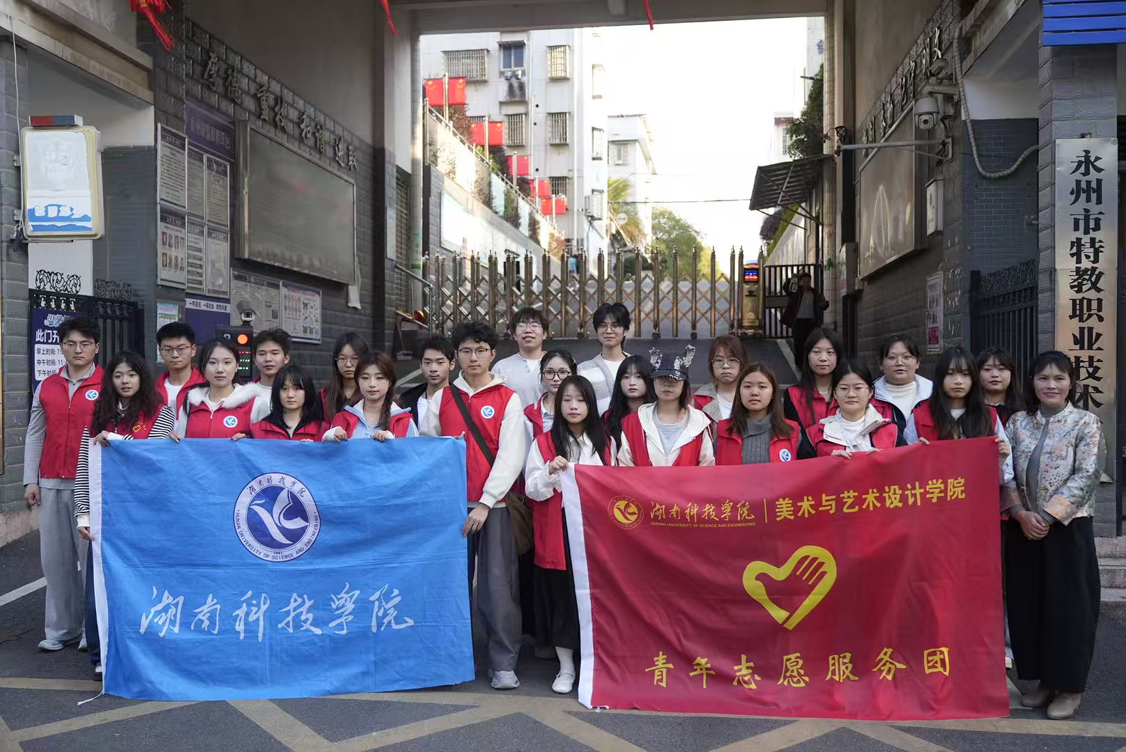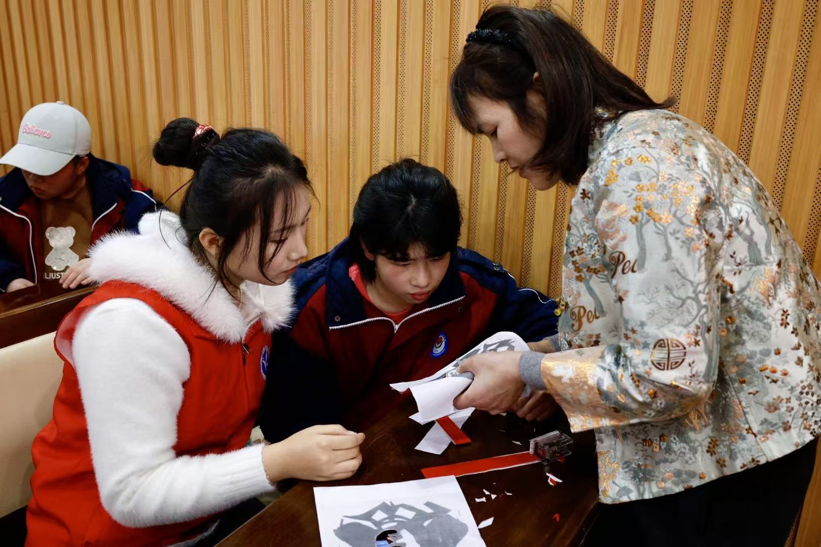 本网讯(通讯员 唐天田)春风送暖,大爱传情。近日,我校美术与艺术设计学院“向阳花”志愿队走进永州市特殊学校,开展“非遗剪纸传薪火 红绢长卷颂雷锋”主题志愿活动,为特殊儿童送上一堂兼具厚度与温度的沉浸式艺术课,让雷锋精神在无声世界绽放光芒。