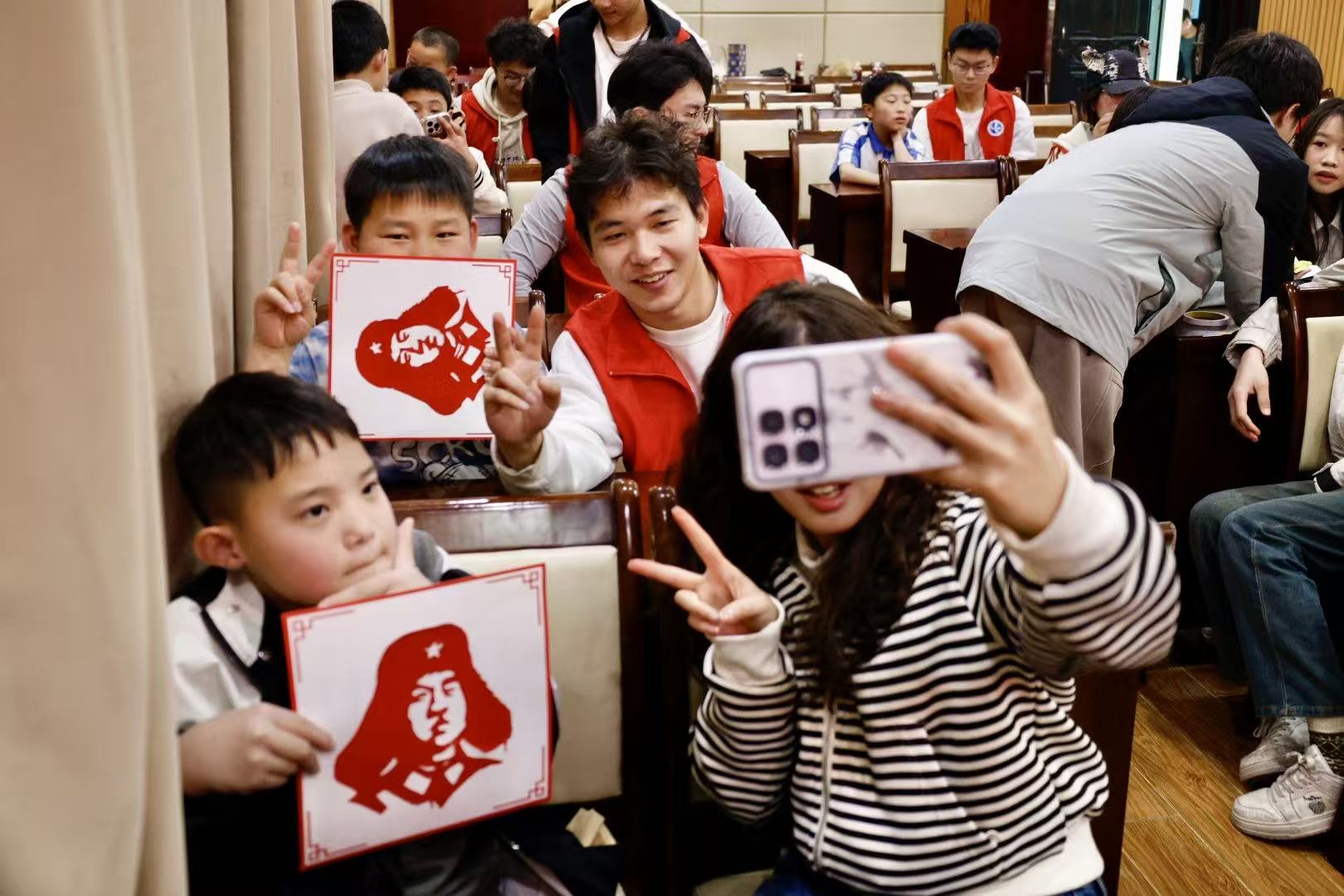 活动现场暖意融融,大学生志愿者们化身“美育导师”,耐心地指导孩子们握刻刀、剪纹样,从对折纸张、勾勒轮廓到精修细节,每一个步骤都细致讲解、反复示范,用温柔打破沟通的壁垒。孩子们凝神专注,指尖翻飞间,一个个鲜活的雷锋形象逐渐浮现。经过160分钟的携手协作,一幅长15米、宽60厘米的剪纸长卷《薪火相传学雷锋》惊艳呈现。这幅由25幅独立画面串联而成的作品,将雷锋精神具象化、可视化,生动诠释了新时代雷锋精神的薪火相传。